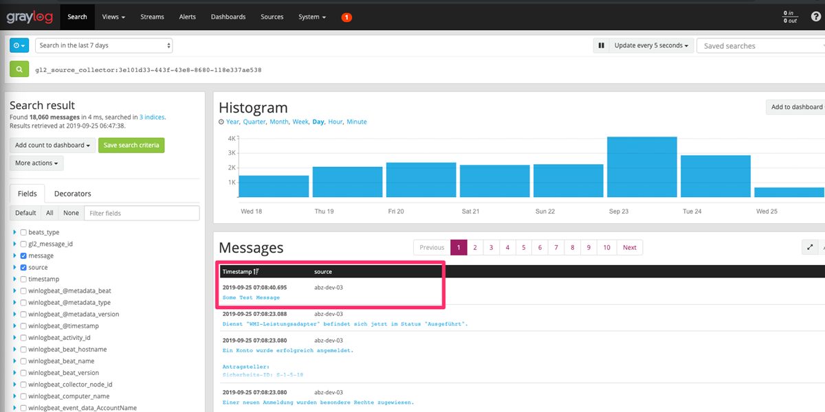 ...und schließlich in Graylog nachschau'n, ob dieser Event auch richtig weitergereicht wurde: