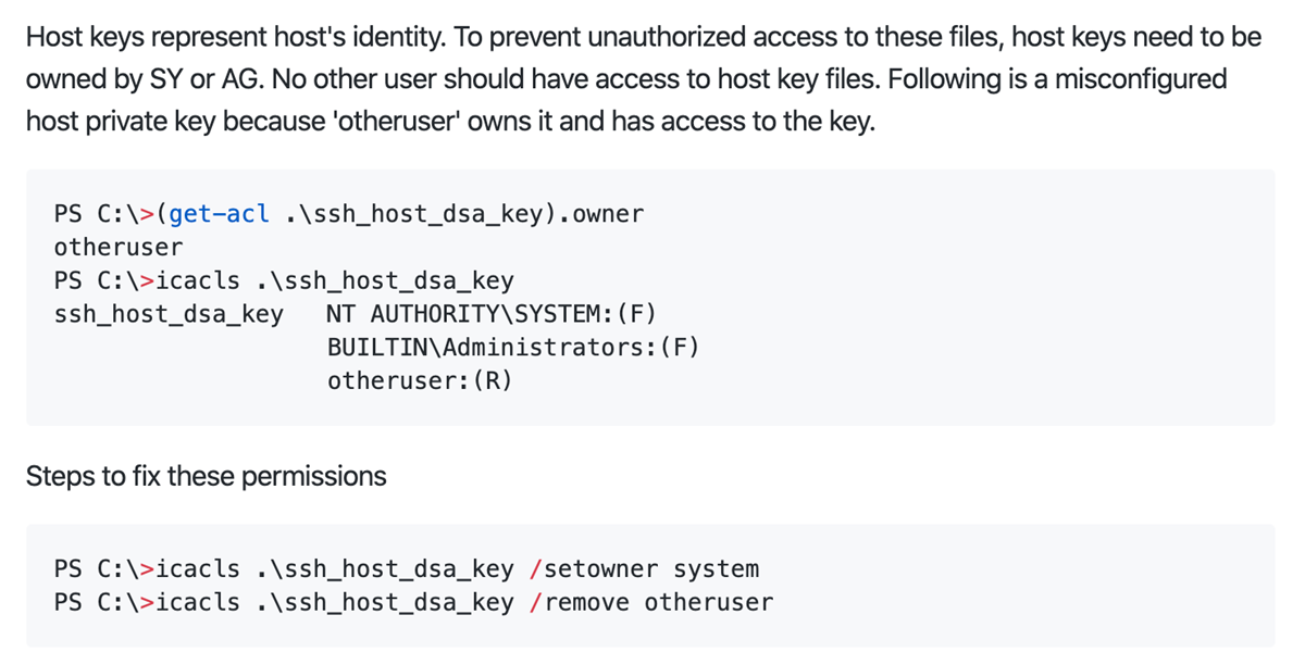 Wenn jedoch der Server nicht startet (weil bspw. die Berechtigungen beim privaten Schlüssel nicht passt -- das Verhalten ist wie man es erwartet also gleich wie unter Unix...), sollte man zur Doku greifen. Hier ist diese Seite ganz wertvoll, wo beschrieben steht, welche Berechtigungen man wie setzt. Ich will das hier nicht wiederholen, da die Doku sehr gut ist (kann man gar nicht besser machen :))