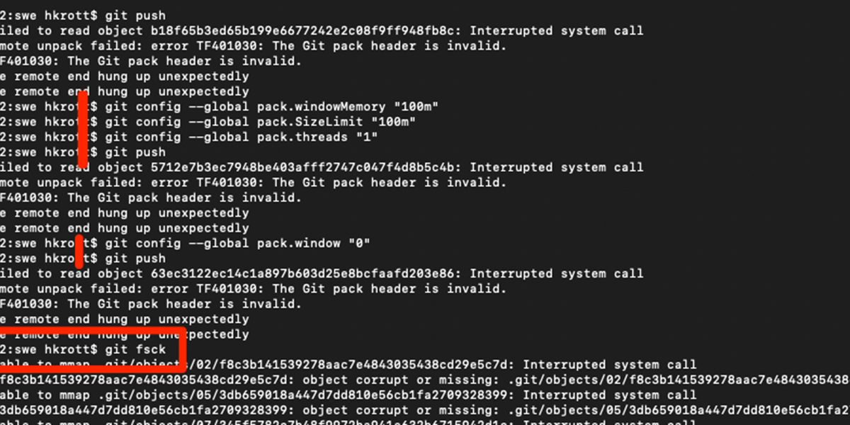Jetzt hatte ich erstmalig ein Problem: ich konnte den lokal commit des Sourcecodes nicht ins zentrale Repository "pushen"; Ich bin (natürlich) nicht der erste, der ein derartiges Problem hat. Die Lösung war unter https://stackoverflow.com/questions/4170317/git-pull-error-remote-object-is-corrupted zu finden. Der folgende Befehl hat wieder alles gerichtet (die weiteren hier markierten Befehle sind aus obigen Link, wären aber m.E. nicht notwendig gewesen...):