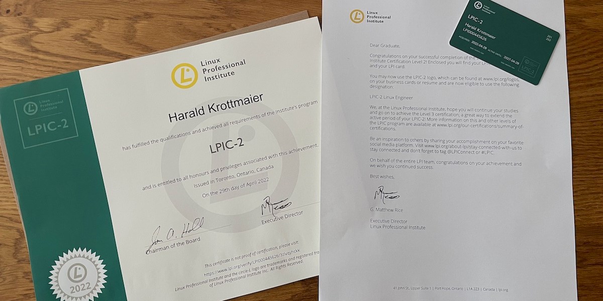 Ich hab' lange überlegt, inwieweit Zertifizierungen sinnvoll sind -- vor allem in meinem Alter :) -- aber es scheint doch für einige Kunden einen "Eintrittskarte" zu sein. Naja. Mit Linux beschäftige ich mich schon seit dem Studium (Schini hat die Disketten immer bespielt; die Images sind direkt aus Finnland gekommen... :)) -- also doch schon seit mehr als 25 Jahren. Die Fragen bei der Zertifizierung waren jedoch m.E. a bisserl weit weg von der Praxis. Aber was soll man tun. Ist ja bei den Microsoft-Zertifizierungen auch so :)