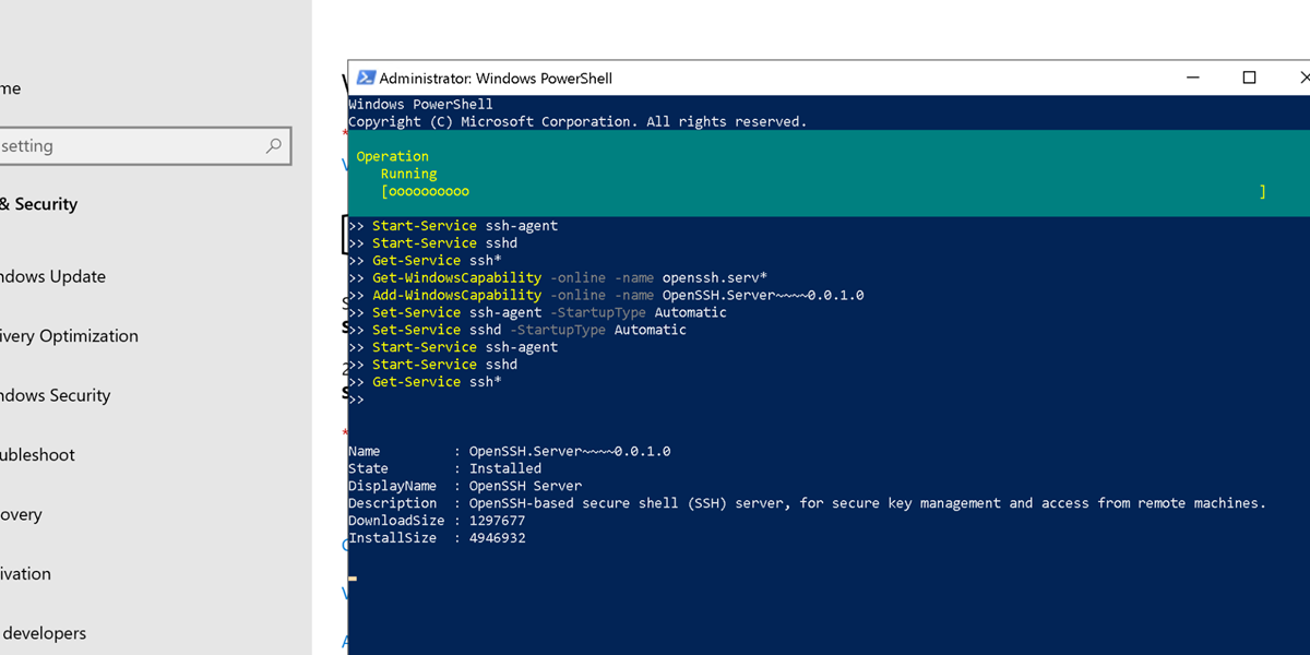 Get-WindowsCapability -online -name openssh.serv* Add-WindowsCapability -online -name OpenSSH.Server~~~~0.0.1.0 Set-Service ssh-agent -StartupType Automatic Set-Service sshd -StartupType Automatic Start-Service ssh-agent Start-Service sshd Get-Service ssh*